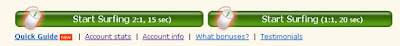 Note. (2:1, 15 sec) artinya anda akan surfing dalam 1 situs selama 15 detik dan akan mendapatkan 0.5 credit sedangkan (1:1, 20 sec) artinya anda akan surfing dalam 1 situs selama 20 detik dan akan mendapatkan 1 credit. 1 credit yang kita terima dapat kita gunakan untuk mempromosikan/menampilkan situs kita 1 kali.Setelah anda memilih salah satu pilihan diatas maka anda akan memulai berselancar atau surfing di EasyHit4U... Yang perlu diperhatikan adalah anda diwajibkan mengklik kata2 tertentu setelah periode waktu yang anda pilih sebelumnya untuk melanjutkan ke situs berikutnya...